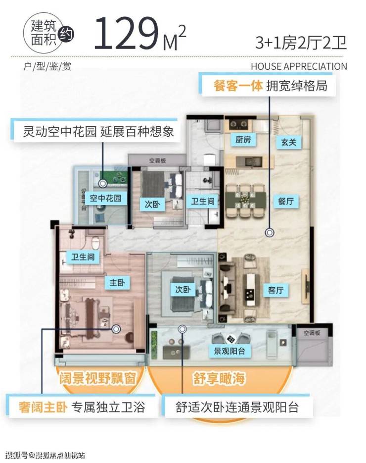 建面约129㎡3+1房,是一个大尺度、大享受的空间,可谓改善终极之选。