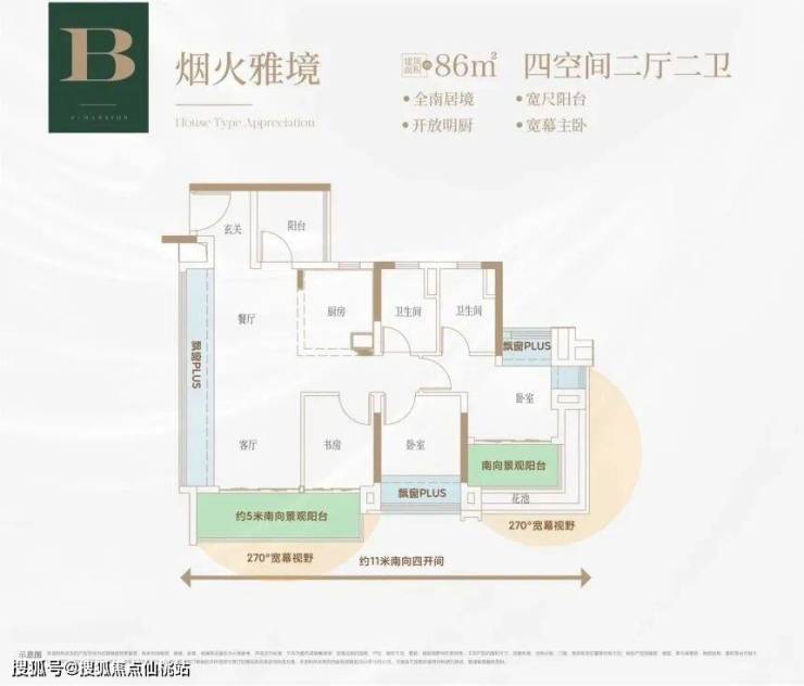 建面约 86㎡户型采用跑道式阳台和餐客厨一体化设计,约 11 米全南向四开间,采光和通风进一步优化。约 5 米长南向 270° 景观大阳台,主卧是套房设计,可南望中央园景泳池。