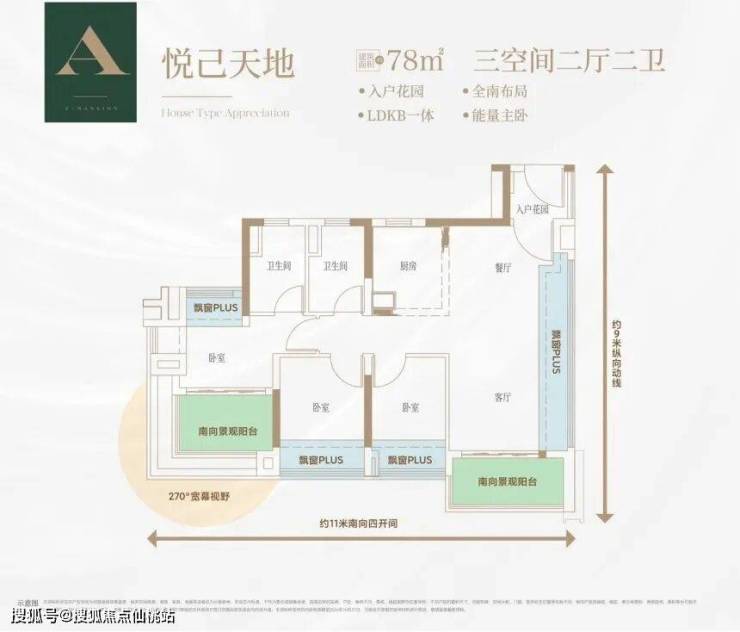 建面约 78㎡户型有约 11 米南向 4 开间面宽,客厅和所有房间朝南,采光和通风条件较好。约 3.45 米客厅开间,主卧有 270° 观景视野,还带有独立卫浴和智能马桶。