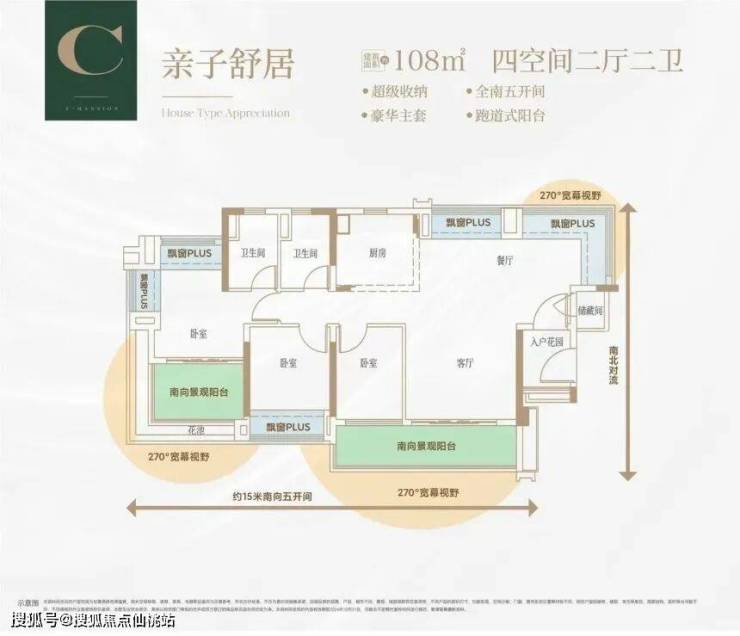建面约 108㎡户型设有转折式独立入户玄关,保证了居住私密性,还具备一定收纳功能。南北通透的 LDK 一体化布局,设有 X 空间,可根据家庭需求改造。约 15 米南向五开间,270° 景观双面宽大阳台,主卧面积超 20㎡,三面采光,带有衣帽间和梳妆台。项目户型空间使用率约 110%,在同等面积下,实际使用空间更大。