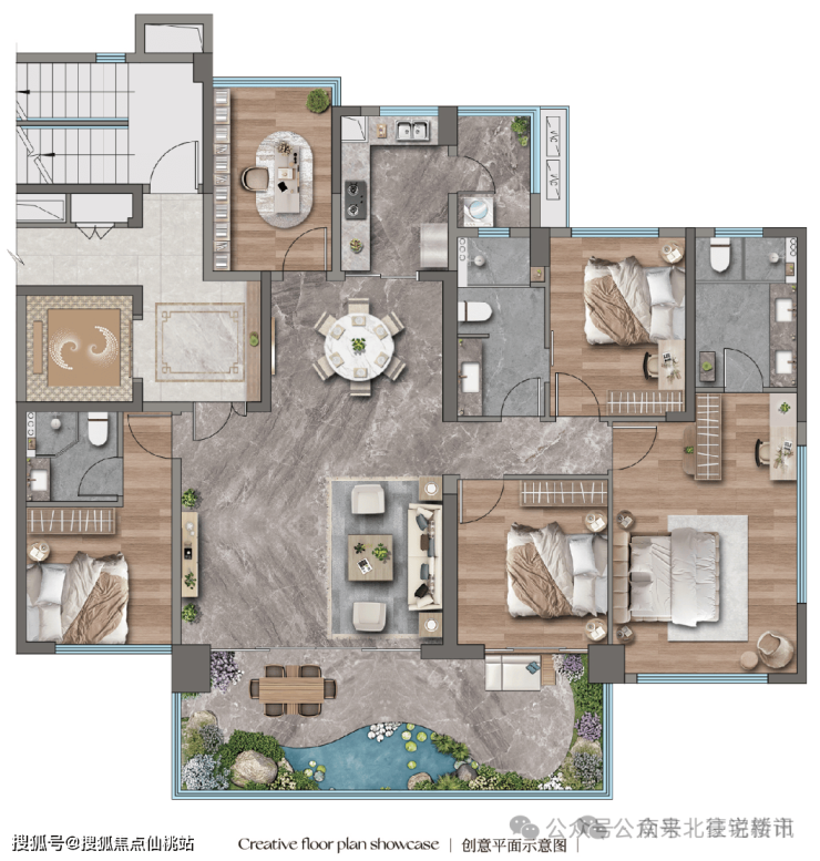 园林景观:以《千里江山图》为蓝本,打造宋韵园林,原株移植海南黄花梨,规划有泳池、儿童游乐区、有氧跑道等。