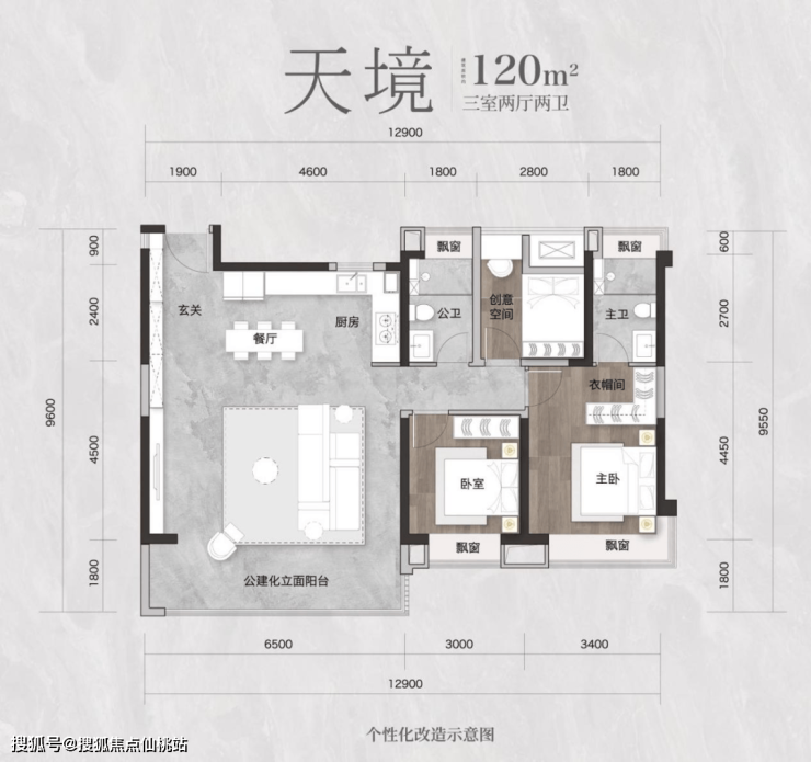 南向三面宽双卧室、约6.5m宽LDKB餐客厨一体化设计,270°转角飘窗主卧套房,尊崇奢阔。