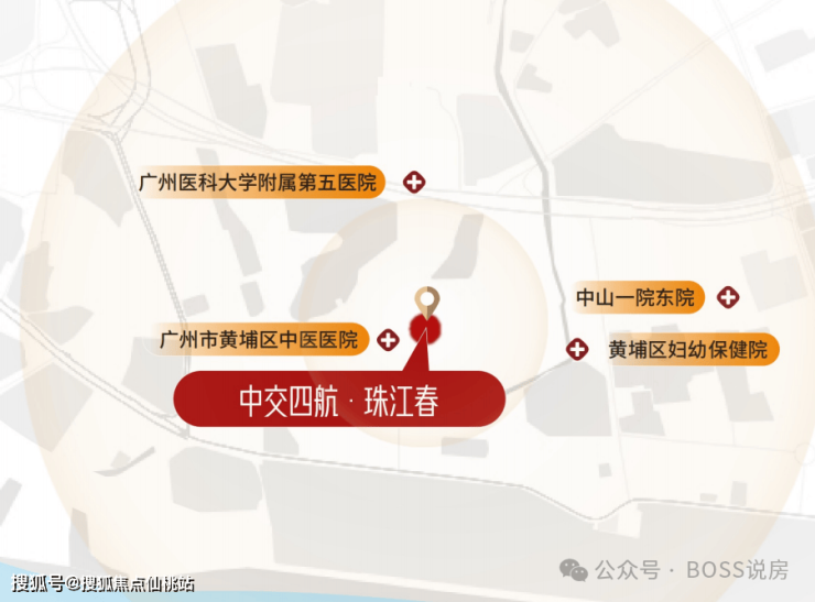 步行可达黄埔区中医医院(约 519 米),1.4 公里是广州医科大学附属第五医院,1.6 公里为中山大学附属第一医院东院(均为三甲),日常诊疗与重症救治都有保障。