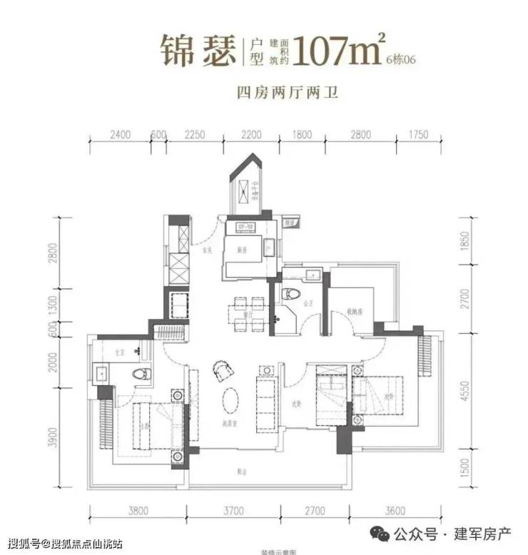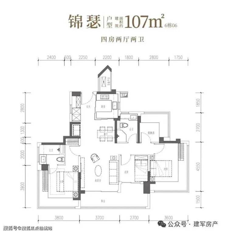 107㎡的4房2厅2卫,设计的是竖厅双龙抱珠格局,客厅3.7米开间,LDKB一体化设计,预留冰箱卡槽位,四开间朝南,主卧+2个次卧270°无柱转角飘窗,分别做到了主卧17.94㎡/次卧16.38㎡/次卧7.56㎡/次卧6.89㎡(包含墙体飘窗),U型厨房烟道外置,卫生间干湿分离,得房率约104.06%(包含赠送),客厅连接次卧出超大阳台约11.76平,东北朝向。