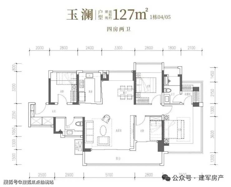127㎡的4房2厅2卫,设计的是竖厅南北通透格局,进门独立玄关,客厅5.1米开间,客餐厅分离化设计,主卧270°无柱转角飘窗+衣帽间,分别做到了主卧18.55㎡/次卧11.2㎡/次卧8.96㎡/次卧7.84㎡(包含墙体飘窗),U型厨房烟道外置,卫生间干湿分离,得房率约98.97%(包含赠送),客厅连接次卧出超大阳台约14.09平,西南或东南朝向。