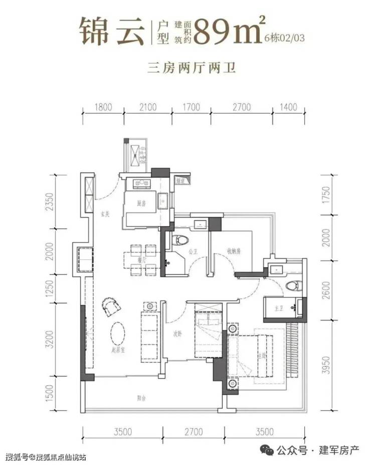 89㎡的3房2厅2卫,6栋02/03户型,设计的是经典竖厅格局,客厅3.5米开间,LDKB一体化,S墙设计预留冰箱卡槽位,三开间朝南,动静分区,主卧+次卧270°无柱转角飘窗,分别做到了主卧15.25㎡/次卧7.56㎡/次卧6.48㎡(包含墙体飘窗),U型厨房烟道外置,卫生间干湿分离,得房率约97.47%(包含赠送),客厅连接次卧出大阳台约11.46平,西南或东南朝向。主要区别在于次卧跟主卫空间。