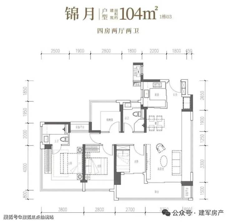 104㎡的4房2厅2卫,设计的是竖厅格局,客厅4.15米开间,LDKB一体化设计,预留冰箱卡槽位,四开间朝南,动静分区,主卧270°无柱转角飘窗还带1个设备平台约1.52平,分别做到了主卧20.34㎡/次卧11.2㎡/次卧7.7㎡/次卧6.75㎡(包含墙体飘窗),U型厨房烟道外置,卫生间干湿分离,得房率约100.71%(包含赠送),客厅连接次卧出大阳台约11.23平,西南朝向。