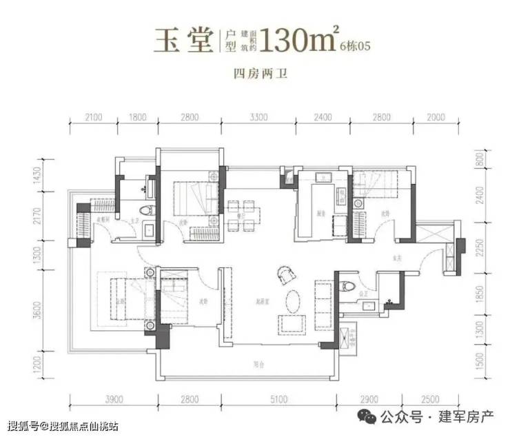 130㎡的4房2厅2卫,设计的是竖厅南北通透格局,进门独立玄关,客厅5.1米开间,客餐厅分离化设计,主卧270°无柱转角飘窗+衣帽间,分别做到了主卧23.66㎡/次卧11.2㎡/次卧8.96㎡/次卧7.84㎡(包含墙体飘窗),U型厨房烟道外置,卫生间干湿分离,得房率约101.95%(包含赠送),客厅连接次卧出超大阳台约14.09平,东北朝向。