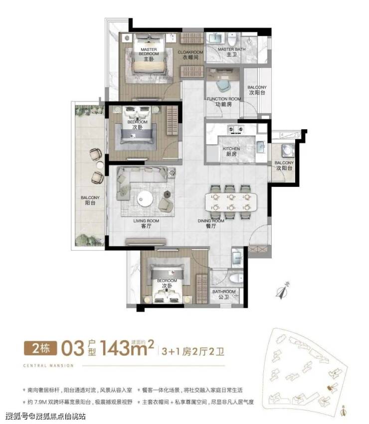 建面约143㎡4房2厅2卫,豪华主卧套房,超大 270°转角飘窗,大面宽采光面+超大方厅,约14.6m超大南向采光面,双面景观阳台+满飘窗,约7.3m 超大阳台。