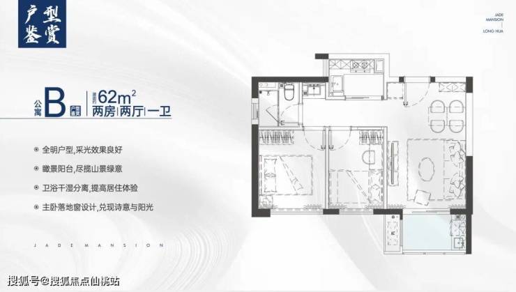 约62㎡ 实现两房两厅一卫功能配置,独立明厨和三分离明亮卫浴,主卧可放置2米双人床,厅出阳台。