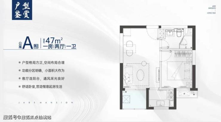 约47㎡ 做到一房两厅一卫功能布局,独立明厨和干湿分离卫浴,客厅开间约3.5米,厅出阳台。