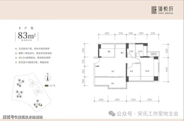 83㎡的3房2厅2卫,B户型设计的是竖厅南北通透格局,客厅3.4米开间,客餐厅分离化设计,动静分区,分别做到了主卧16.13㎡/次卧8.87㎡/次卧8.54㎡(包含墙体飘窗),L型厨房,卫生间干湿分离,得房率约100%(包含赠送),阳台约6.12㎡西南朝向。