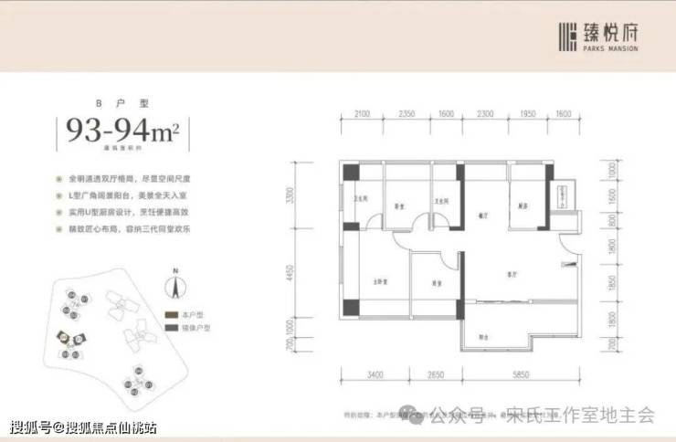 94㎡的4房2厅2卫,B户型,设计的是竖厅南北通透格局,客厅3.4米开间,客餐厅分离化设计,动静分区,分别做到了主卧15.13㎡/次卧8.94㎡/次卧8.88㎡/次卧7.75㎡(包含墙体飘窗),U型厨房,卫生间干湿分离,得房率约100%(包含赠送),阳台约8.5㎡西南朝向。