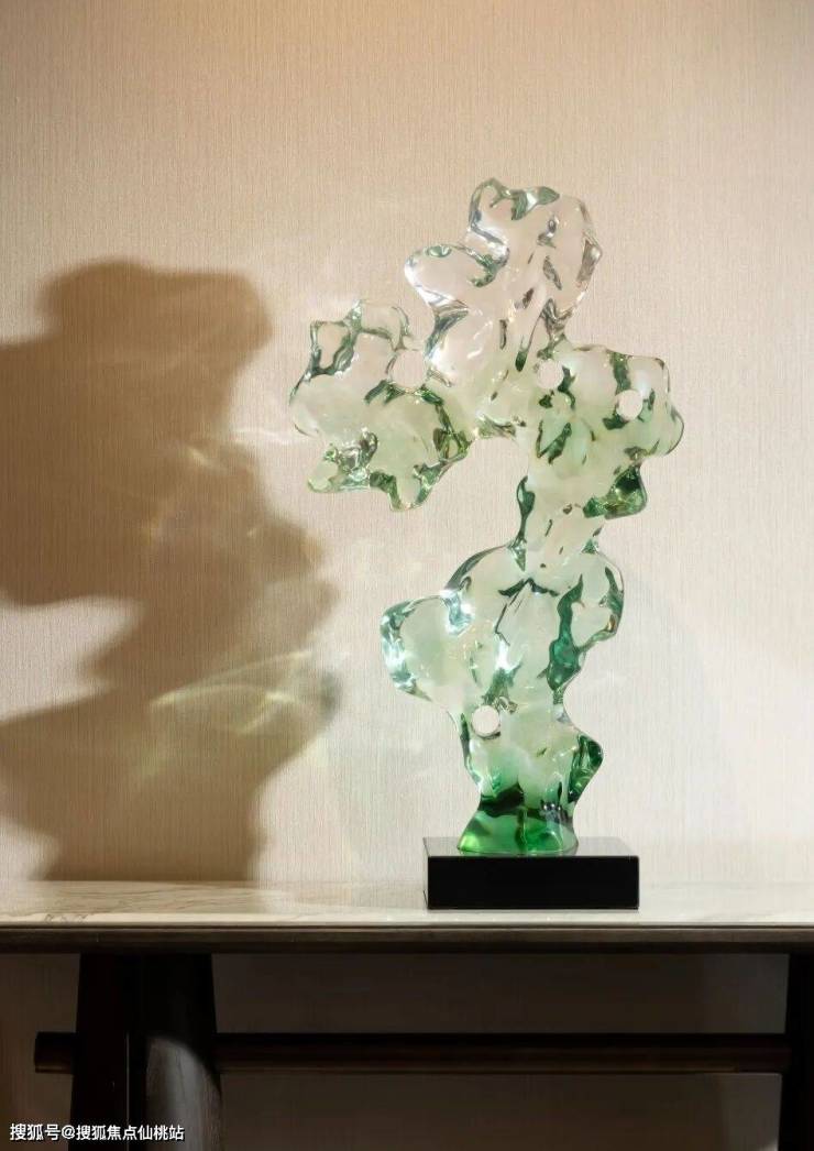 “山水剪影”艺术墙贯穿门厅与走廊,石材拼贴出宋画《溪山行旅图》的抽象变体,光影投射下,行人如游画中。电梯厅悬挂“天蓝釉刻花鹅颈瓶”复刻雕塑,裂纹釉面在射灯下泛出粼粼微光,仿佛将北宋官窑的千年气韵凝于一瞬。门厅在晨光中显得格外清晰,漫步于此,仿佛穿越千年的山水画卷。
