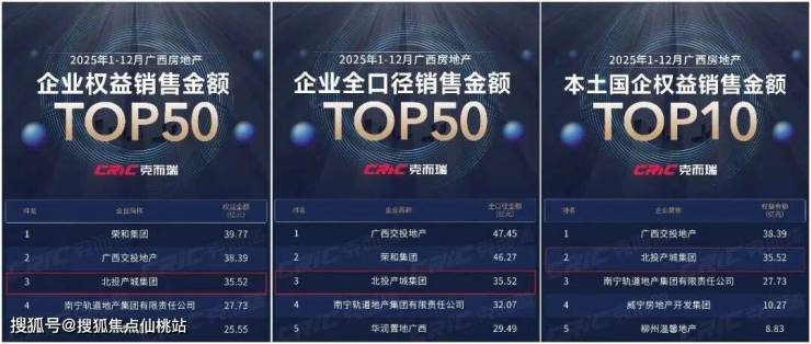 北投产城的实力不用多说,克尔瑞数据显示,它在2025年广西房企多项销售榜上均位列前三甲,权益销售金额更是排在广西本土国企TOP2。