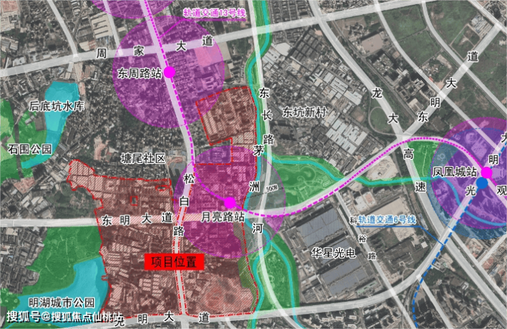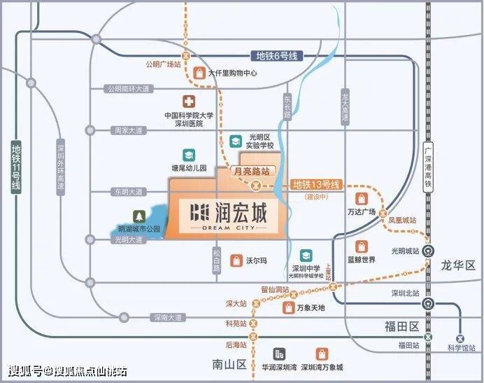 华润润宏城位于光明区凤凰街道塘尾社区,光明大道和东长路交汇处的西北侧,刚好在13号线“月亮路站”附近,北部接壤东周路。