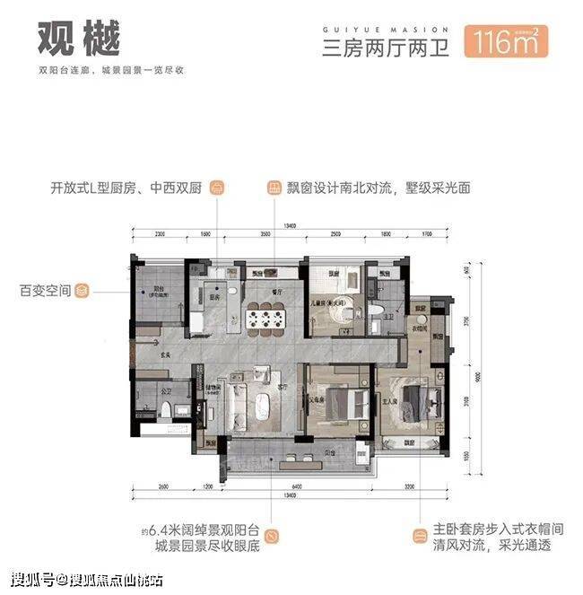 116㎡四房更妙,实现了广东人都爱的南北对流设计,开放式L型厨房,中西双厨,在此,既可以烹饪美食,也能呼朋唤友,打造社交主场。双阳台连廊设计,瞰景视角达到6.35米,超大采光面,把容桂城心美景、中轴园林尽收眼底。