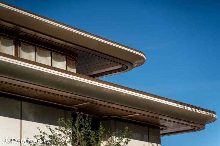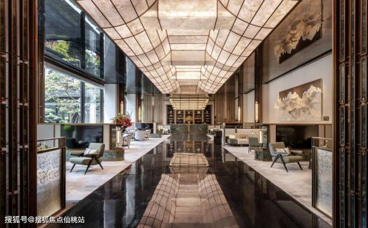 楼盘大门仍然是建发标志性的重檐庑殿顶,但这一次,他们用圆润的曲线取代了飞檐翘角,把煊赫的坡屋顶意象藏在了大堂室内的天花板上。这大概就是朱熹所说的「安舒而不矜肆」。