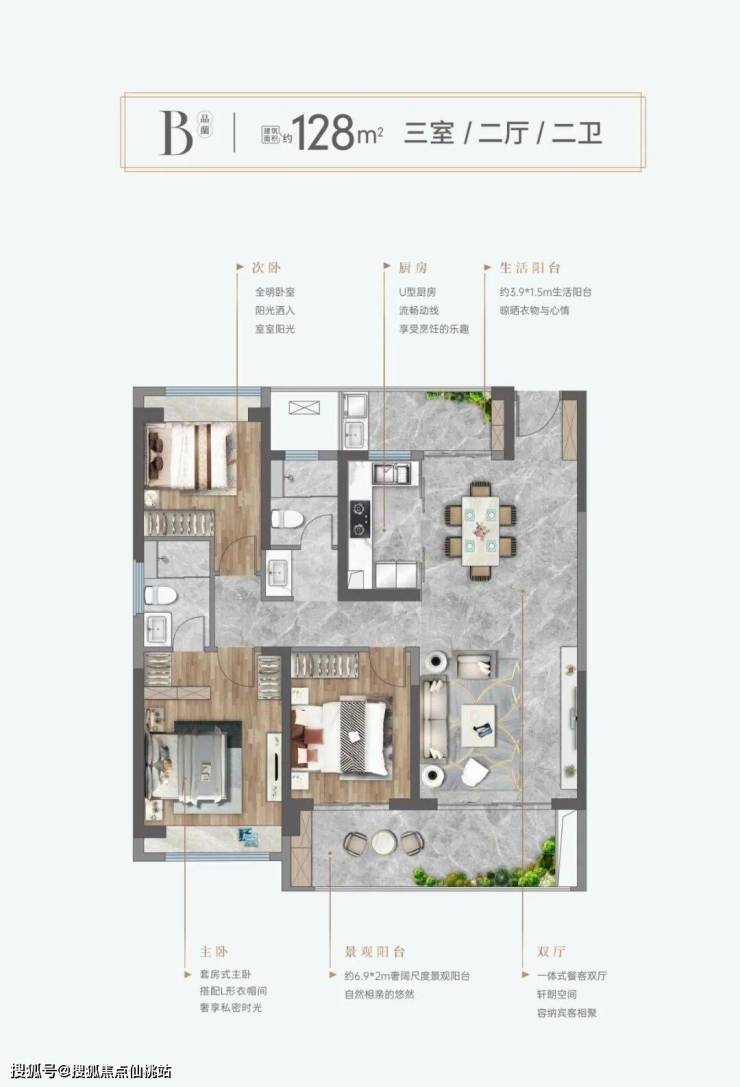 • 128㎡三房:6.9米景观阳台,南北通透,主卧套房+步入式衣帽间。