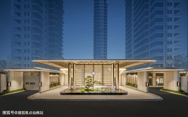 主入口门庭以学府高雅气质与庄重高墙规制面向城市,营造一方落客港湾,迎接高知菁英入境。臻选冠幅近5.5米的名贵迎客松,并以600余片定制青玉打造巨幕奢石景墙,呈现尊崇且轻松的惬意归家感。