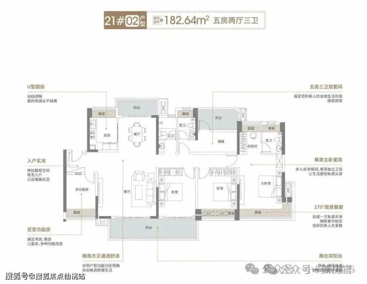 182㎡四房双套间:五开间朝南,主卧270°转角飘窗,南北双阳台,短进深设计让阳光无死角渗透。