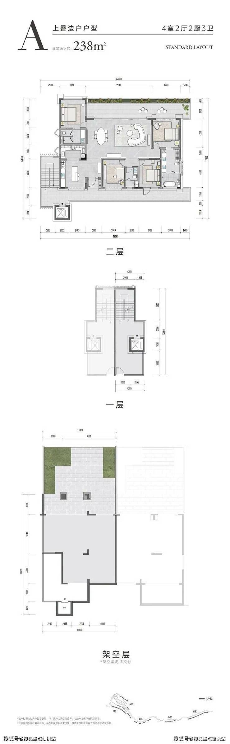 相比于下叠,上叠进一步发挥想象,虽然仅建面约 172㎡,但依然 保留客餐厅区域的阔尺空间等优点。
