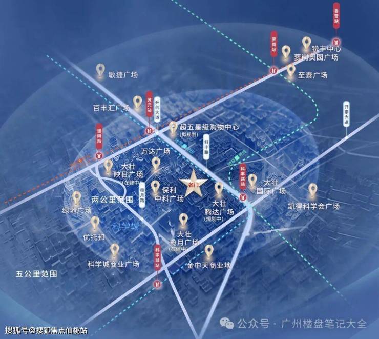 大壮名城·名门占据城市核心地段——科学城核“芯”黄金2公里(科丰路与开创大道的十字路口交汇处),集聚政务中心、商贸中心、发展中心于一体