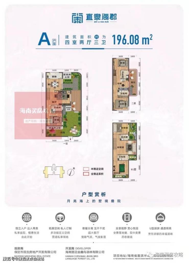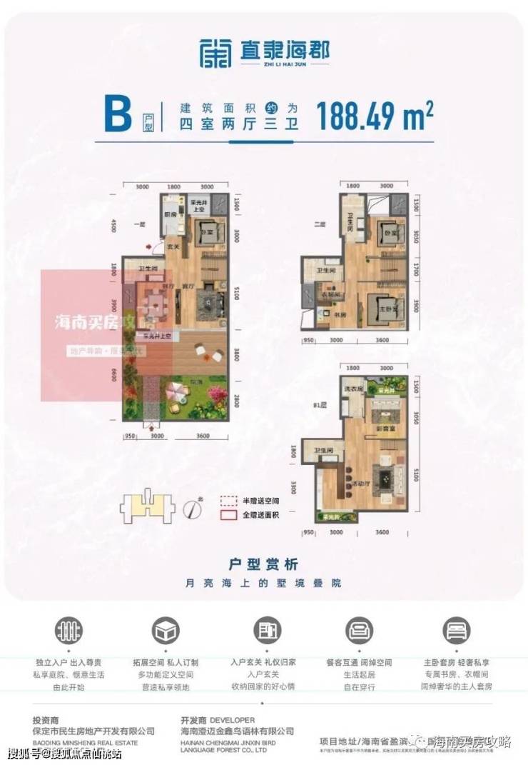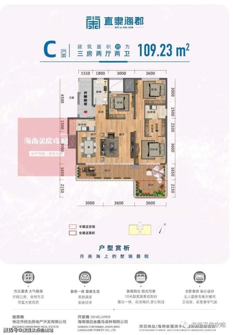 民生·直隶海郡—位于海南省澄迈市老城经济开发区盈滨半岛,是海口西海岸“22公里黄金海岸线”的延伸区。盈滨半岛三面环海,形似弯月,以内外双海湾的独特景观资源闻名,沙滩细软无泥,海水碧蓝纯净,岛上还有火山温泉。由中国建筑研究院陈一峰团队担纲设计,以叠院式洋房设计,私密性高的庭院,优渥的绿化景观,完善的酒店管理,多远活力的商业等亮点,打造成滨海度假型居住及商业配套成一体的品质居住社区。