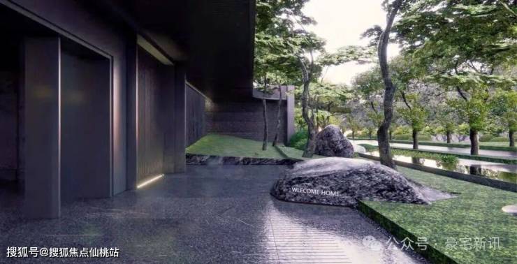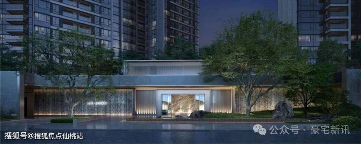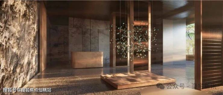 入口50米横向面宽,近6米的高跌水景墙与双层门楼让回家有了一份尊贵与隐奢;随着动线经过穿林,见山,伴水,来到模仿山石色调与铜色金属融合打造的酒店式大堂,一路草木清香、青石铺地、水系流动,自然的隐奢之美扑面而来。