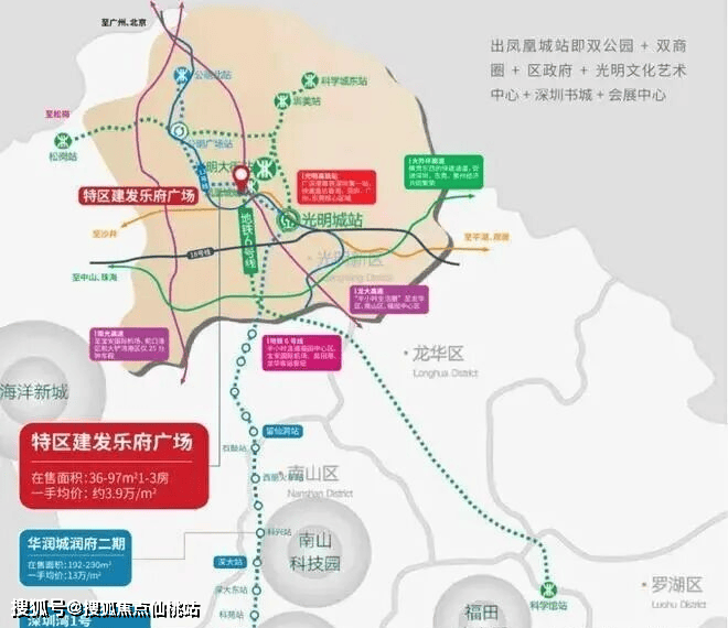 特区建发乐府广场位于光明区光明大道和观光路的交汇处西侧、(地铁6号、13号线凤凰城站口),龙大高速光明出口处,紧邻区政府,雄踞光明科学城门户的重要位置,占据光明区政治、经济、文化中心,紧邻占地约10万㎡开明公园、占地约57万㎡区级市政公园新城公园,周边各项配套日益完善。
