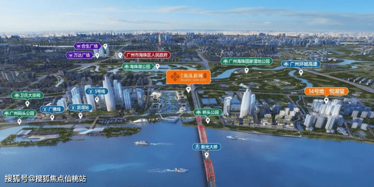 休闲——1100万平方米全国城市中心最大的广州海珠国家湿地公园,面积是曼哈顿中央公园的2.5倍多,被称为广州的“南肺”,生态环境得天独厚,是大湾区生态文明展示窗;同时周边环绕海珠湖公园、瀛洲生态公园和规划中的滨江公园等;