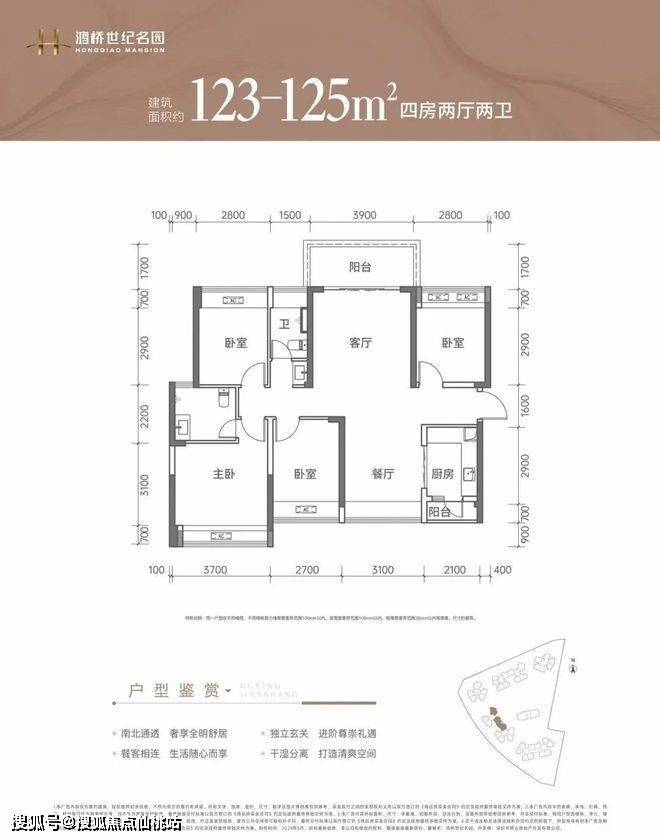125㎡的4房2厅2卫:竖厅南北通透格局,客厅3.9米开间,LDKB一体化设计,4个卧室分别做到了3.7米/2.8米/2.8米/2.7米的宽度,L型厨房带1个小生活阳台,公卫三段式分离,阳台主朝东北或东南向。