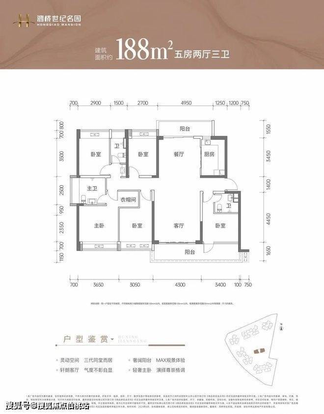 188㎡的5房2厅3卫:竖厅格局,南北通透双阳台,客厅4.3米开间,LDKB一体化设计,双主卧套间设计,5个卧室分别做到了3.65米/3.4米/3.05米/2.9米/2.7米的宽度,L型厨房带1个小生活阳台,公卫三段式分离,客厅阳台连接次卧出7.7米长的大阳台,主朝正南向。