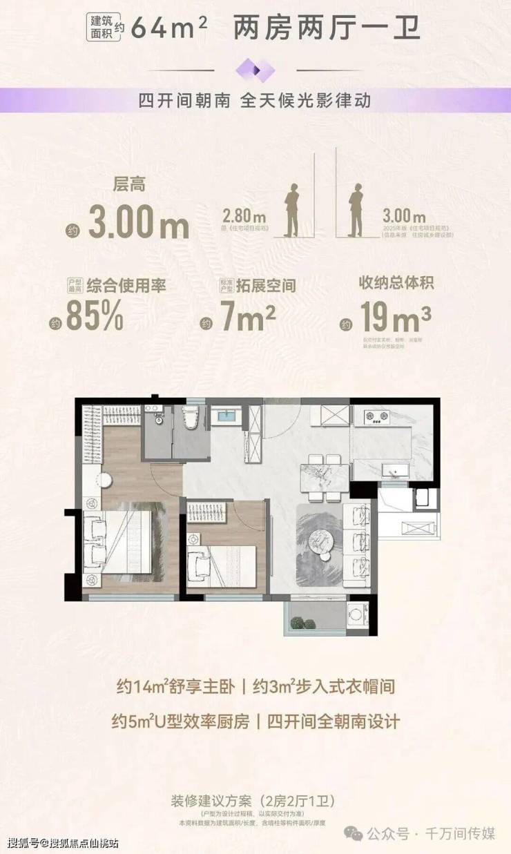 ·64㎡两房:首开的7#楼 仅30套,层高3米,综合使用率85%,使用面积相当于目前市场上75㎡的户型,客厅卧室全朝南,主卧14㎡带衣帽间,华为鸿蒙智慧+顶配精装。总价折后290万起,基本是岛内新房最低门槛!