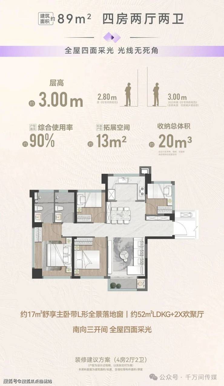 ·89㎡四房:岛内唯一边套4房,综合使用率90%,是整个岛内的王炸户型,总价约410万,这个价格闭眼买!