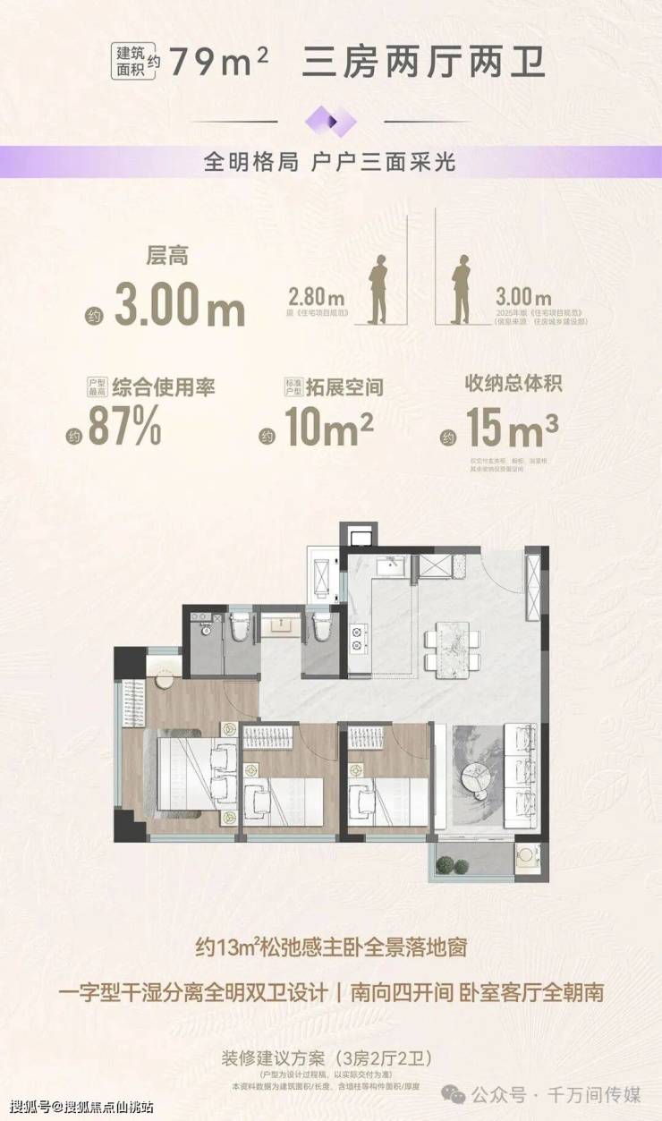 ·75㎡-79㎡三房:首开仅各30套,折后总价340万起,层高3米,综合使用率 84%-87%,厦门近10年罕见的80平以内做3房,总价比上一代3房产品省了100 万以上。