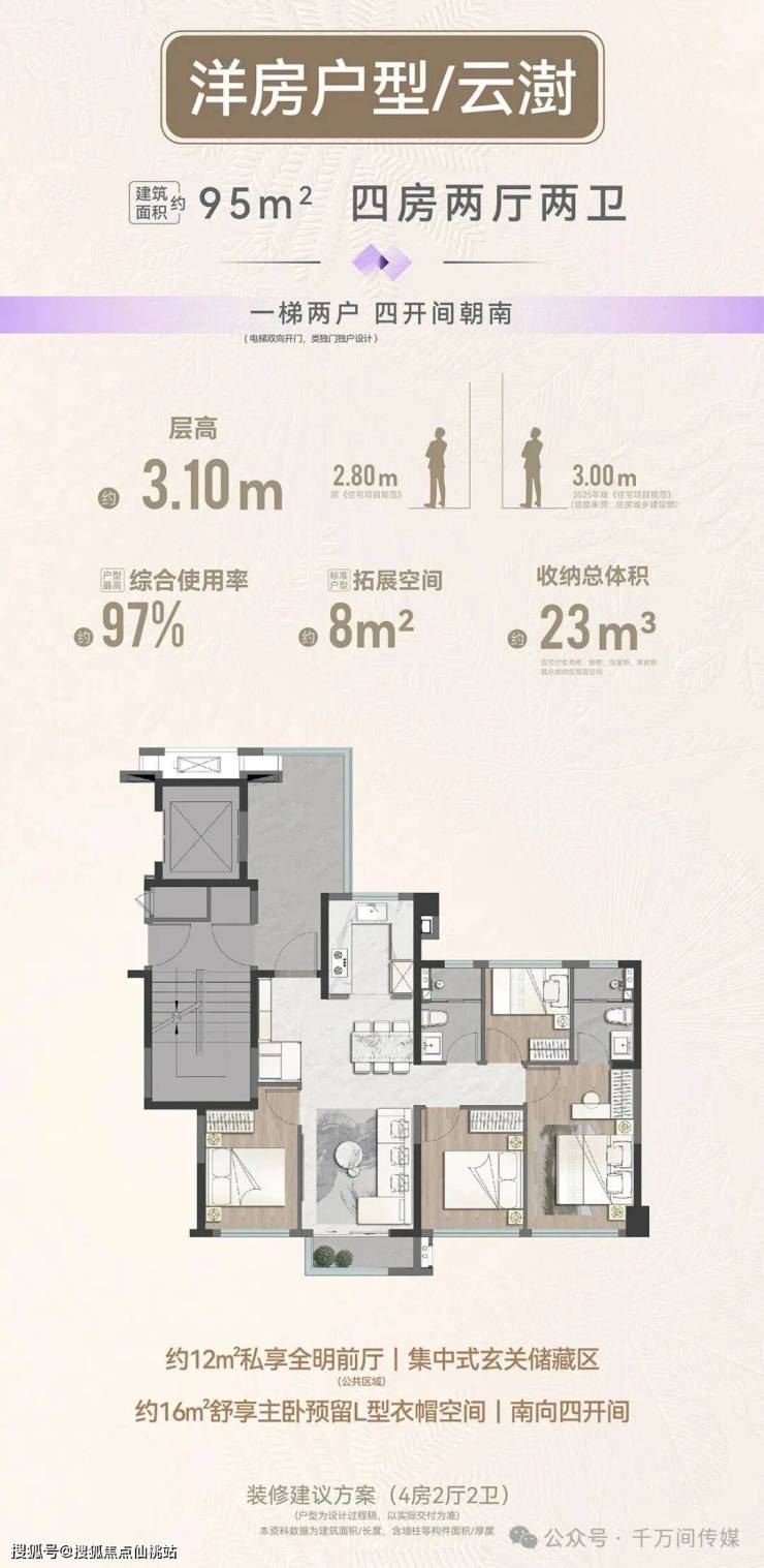 ·95-112㎡洋房:95㎡总价480多万,综合使用率97%;112㎡折后总价560 多万,综合使用率98%;户户带约13 ㎡电梯前厅,2-5层带6-9㎡晒台,是思明区唯一在售洋房!