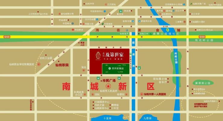 地处仙桃市文化政治中心,南临市政府、江汉市中级人民法院、中级人民检察院。周边博物馆、音乐厅、少年宫等城市文化配套正在建设中,西临仙桃市海关局、仙桃职院,北临沔街美食文化街及正在建设的银泰商业中心。