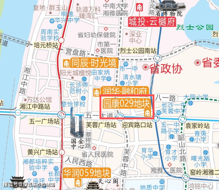 项目东临迎宾路,紧挨着五一大道,地铁2号线、6号线换乘站迎宾路口站正地铁口,北面是八一路小学,东面一路之隔是长沙市一中芙蓉中学,沿五一大道向西1公里是芙蓉广场、1.5公里是五一广场,向东1公里是袁家岭商圈,周边2公里范围内还有湘雅二医院、省人民医院、烈士公园、国金中心、黄兴路步行街、天心阁等诸多配套。