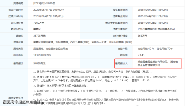 项目正是去年6月园康&信宇在经历了50轮竞价之后,以溢价率约49%联合摘得的芙蓉中心黄土塘地块,折合楼面价约11156元/㎡。