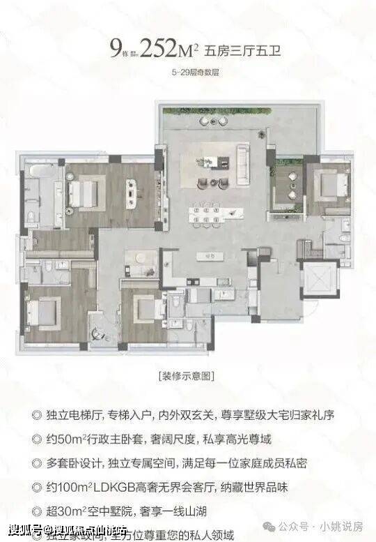 主推 120-255㎡的四至五房改善型大户型。如 120㎡四房采用 LDKGB 一体化设计,客厅连 6.8 米错层挑高露台;143㎡五房拥有 270 度环幕玻璃幕墙,3.15 米层高;255㎡楼王户型自带独立 “空中花园”