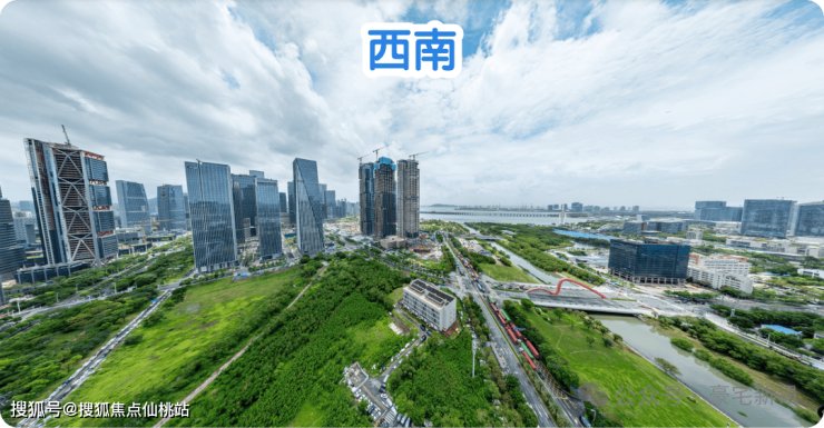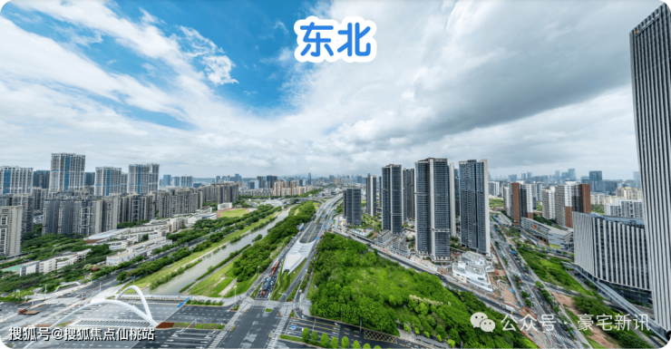 东北:楼下近距是公园绿地和双界河东段景观,远处看新安老城方向,整体远景城市景观为主。