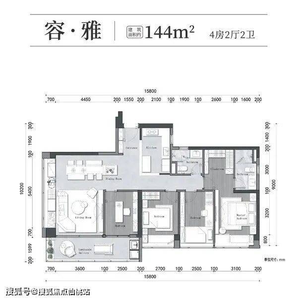 建面约144平的4房户型为南向,四个卧室都是朝南,客厅还做了一个约5.2米的飘窗,采光通风都不错,而且靠近客厅的那个书房用不着还可以打掉,扩大客厅的空间。