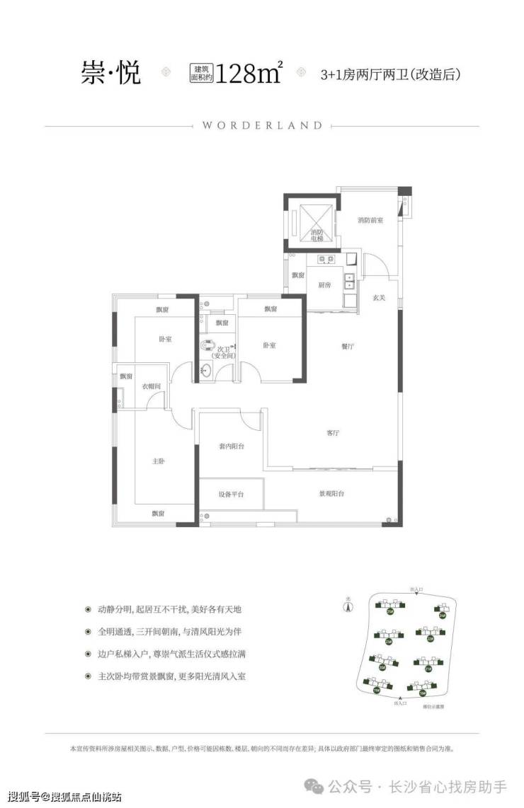 建筑面积约128㎡3+1房、约5.9m客厅开间、得房率约113%(含电梯厅)