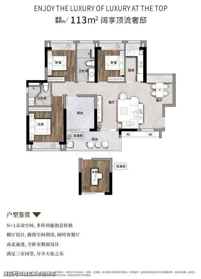 :阔绰的客餐厅满足日常休闲与接待需求,主卧套房设计,配备独立卫生间和衣帽间,提升居住品质。3 + 1 房的布局,满足三代同堂家庭的居住需求,一步到位享受幸福生活。