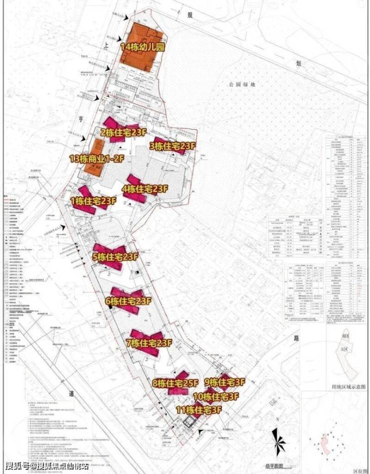 整个小区占地约3.4万平米,规划了11栋住宅。有意思的是,它采用了现在比较常见的“高低配”设计:最南边的9到11栋只有3层高,推测可能是类别墅或者叠拼产品;而其他楼栋基本都是23层以上,最高的8栋有25层。这种布局,一方面能做出产品差异,另一方面也控制了整体的容积率。