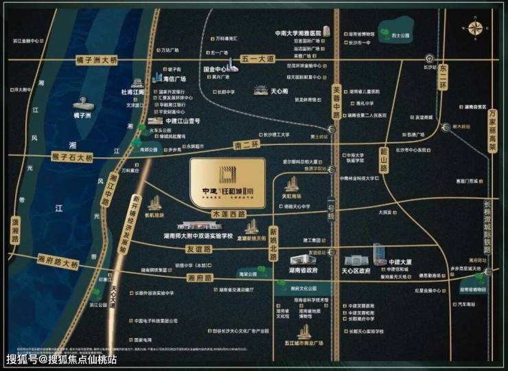 中建·钰和城东临“黄金政经大道”芙蓉路,西临湘江中路,北临南二环,南临木莲路,距地铁1号线铁道学院站约1公里(百度地图直线测距),有全长约22.1公里的“天心大道”承北启南,串联主城繁华;毗邻五一广场、侯家塘、东塘、新开铺商圈等城市级核芯商圈,尽享都会精彩;配套师大附中双语实验学校本部,强大师资助阵,主城骄子近享九年一贯制菁英教育,小升初无忧。