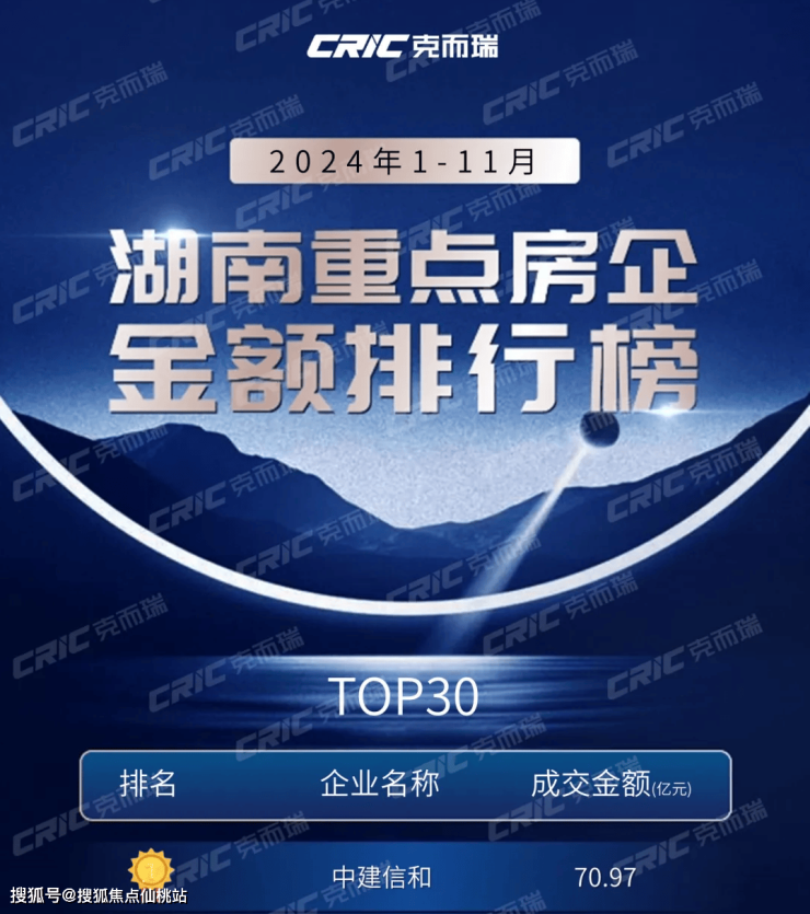 2019年,投资额、销售额、投资回款、营业收入四项指标均过百亿,成功入围“中国房地产百强企业”,此后一直稳定在TOP100行列。2024年,中建信和以70.97亿元的业绩,登顶克而瑞1-11月湖南重点房企金额排行榜TOP1,发展步履稳健,产品备受市场认可。