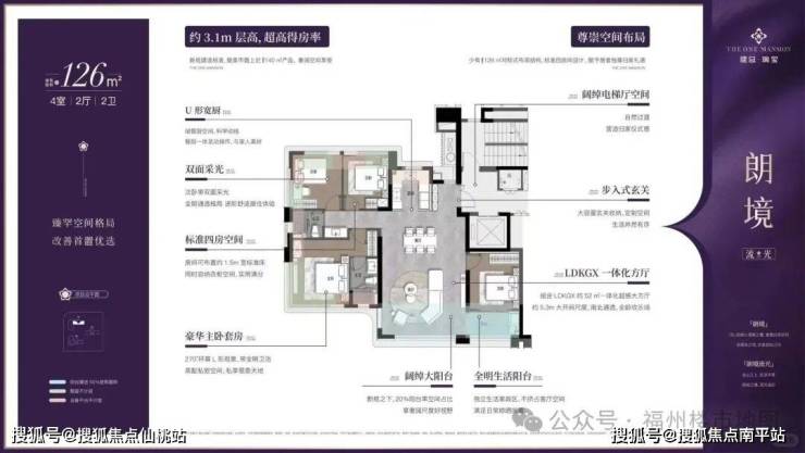 126平四房两厅两卫产品(60套):位于1号楼,楼高31层,层高3.1米,两梯两户,公摊27.9%;楼层差100-600元/平,备案区间价格3.0-3.37万/㎡,总价380-427万/套。