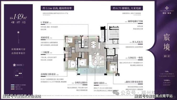 149平四房两厅三卫产品(106套):位于2、3号楼,楼高24-31层,层高3.1米,两梯两户,公摊24.1%;楼层差100-600元/平,备案区间价格3.19-3.60万/㎡,总价477-538万/套。
